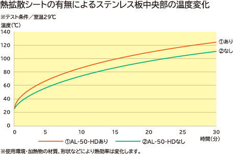 | 熱拡散シートの有無によるステンレス板中央部分の温度変化 |