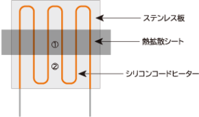 ![]() ![]() ※ステンレス板(厚み:3mm、サイズ:150×150mm)上にシリコーンコードヒーター(SC100-50-1000)を乗せ、帯状に熱拡散シート(AL-50-50-HD)を設置。ヒーターに接しないステンレス板中央部の①②部分の温度を測定。 |
